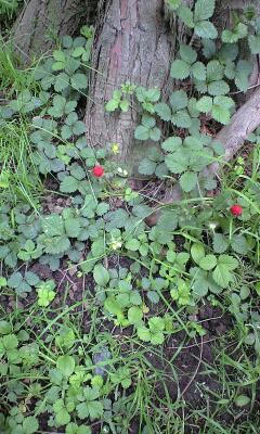いつも日曜日に通る浦和の別所沼公園のメタセコイアの木の根元にヘビイチゴとそれとよく似た葉っぱで黄色い花のキジムシロ。