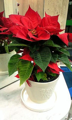 夜仕事を終えて事務所を出ようとした時、玄関ホールの壁にポインセチアが置かれているのに気がつきました。